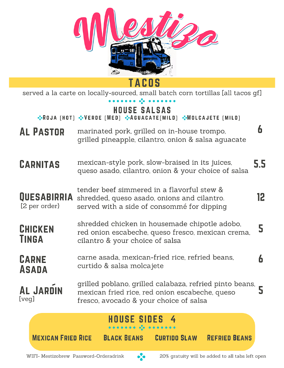 Welcome to Mestizo Brew Cantina, where vibrant flavors and a unique atmosphere await you at 6800 W 38th Ave, Wheat Ridge, CO. This delightful eatery has transformed an old auto oil change shop into a lively restaurant and brewery, offering a fantastic culinary journey through authentic Mexican and Ecuadorian dishes.